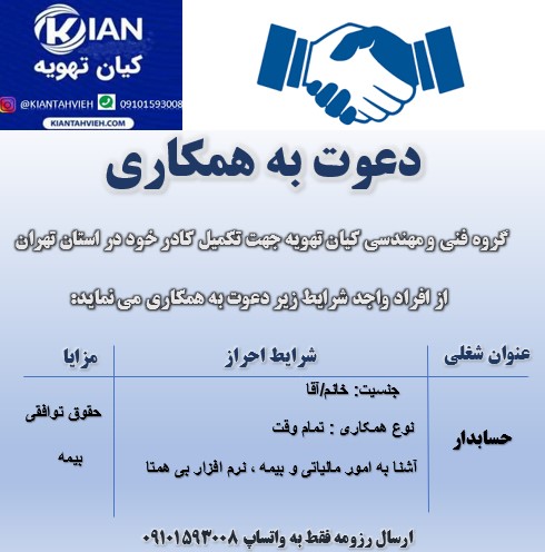 شرکت فنی و مهندسی کیان تهویه جهت تکمیل کادر خود در استان تهران از واجدین شرایط زیر دعوت به همکاری می نماید